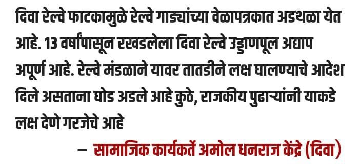 २०१२;२०१३ मध्ये पुलाला मंजुरी मिळाली दिवा रेल्वे स्थानकातील रेल्वे फाटक बंद करून त्याजागी पूल उभारण्याच्या प्रस्तावाला सन २०१२-१३ मध्ये मंजुरी देण्यात आली. उड्डाणपुलाचे रेल्वे रुळांवरील भागाचे काम पूर्ण झाले असून त्याला जोडणाऱ्या मार्गांचे कामरित्या अपूर्ण आहे. छत्रपती शिवाजी महाराज टर्मिनस ते दिवा लोकल साठी सामाजिक कार्यकर्ते अमोल केंद्रे आणिअश्विनी अमोल केंद्रे या दांपत्याने अनेक आंदोलने केली मात्र प्रशासनाकडून कुठलीही दखल न घेता रेल्वे प्रवाश्यांना नाहक प्रवासाचा सामना करावा लागत आहे